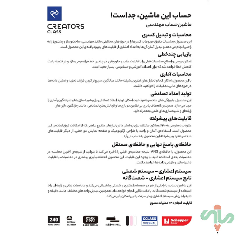 آیا به دنبال یک ماشین حساب مهندسی با امکانات ویژه هستید؟ ماشین حساب سی کلاس کریتورز مدل مهندسی، انتخابی ایدهآل برای شماست! این محصول با ویژگیهای منحصر به فرد خود، تمامی نیازهای محاسباتی شما را در حوزههای مختلف برآورده میکند. • حساب این ماشین جداست! این ماشین حساب مهندسی با قابلیتهای پیشرفته خود، امکان انجام محاسبات دقیق و تبدیل کسری را به راحتی فراهم میکند. چه در مهندسی ساخت و ساز باشید و چه در آشپزی، این محصول به شما کمک میکند تا کسرها را به اعداد اعشاری تبدیل کنید و محاسبات خود را به سادگی انجام دهید. • بازیابی چند خطی: با قابلیت عقب و جلو رفتن در چندین خط، میتوانید محاسبات قبلی خود را بررسی و اصلاح کنید. این ویژگی به شما کمک میکند تا خطاها را کاهش دهید و برای اهداف آموزشی و حسابرسی بسیار مفید است. • محاسبات آماری: این ماشین حساب امکان انجام تحلیلهای آماری پیشرفته مانند میانگین را به شما میدهد و فرآیند تجزیه و تحلیل دادهها را در حوزههای مالی و تحقیقات تسریع میکند. • تولید اعداد تصادفی: با این محصول، امکان تولید اعداد تصادفی برای شبیهسازیها و نمونهگیریهای آماری فراهم میشود. این ویژگی انعطافپذیری بینظیری در بازیها و آزمایشهای تصادفی مانند رمزنگاری بازیهای رایانهای و شبیهسازیهای علمی دارد. • قابلیتهای پیشرفته: با دسترسی به 240 عملکرد مختلف، این ماشین حساب تمامی نیازهای متنوع ریاضی شما را پوشش میدهد. طراحی ارگونومیک و صفحه نمایش دو خطی، استفاده آسان و راحت از این محصول را تضمین میکند. • حافظهی پاسخ نهایی و حافظهی مستقل: با حافظهی ANS، نتیجهی محاسبهی قبلی ذخیره میشود تا بتوانید از آن در محاسبات بعدی استفاده کنید. این قابلیت انعطافپذیری بیشتری در محاسبات با قابلیت ذخیرهسازی و بازیابی دادهها به ارمغان میآورد. • سیستم اعشاری - سیستم شصتی: این ماشین حساب به راحتی از هر دو سیستم اعشاری و شصتی پشتیبانی میکند. محاسبات زمانی و زاویهای را با دقت بالا انجام داده و تبدیل واحدهای مختلف مانند دقیقه و ثانیه را با سرعت بالا ممکن میسازد. با انتخاب ماشین حساب سی کلاس کریتورز مدل مهندسی، تجربهای بینظیر از محاسبات دقیق را داشته باشید! همین حالا اقدام کنید و از قابلیتهای فوقالعاده این محصول بهرهمند شوید.
